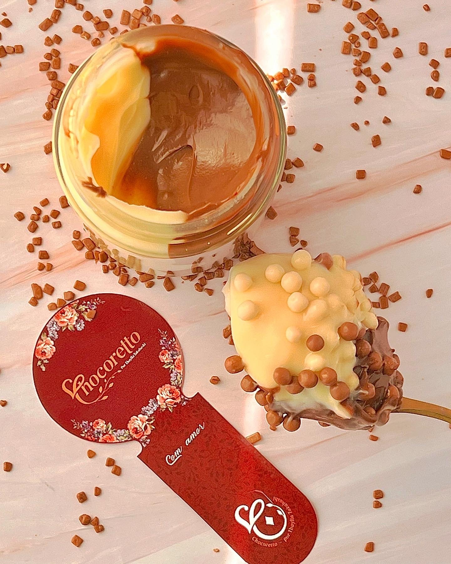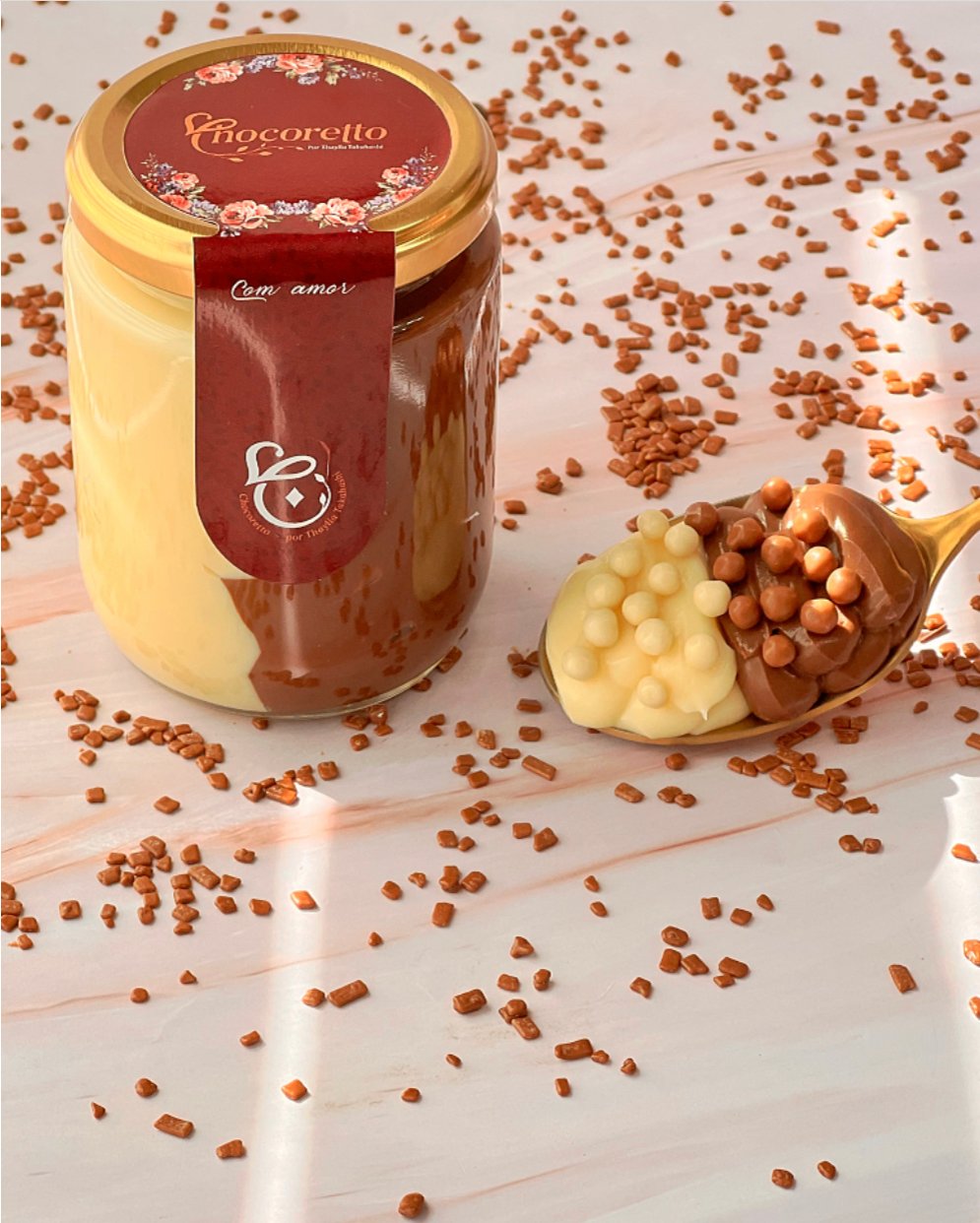 Pote com dois sabores de brigadeiro cremoso para se comer de colher.Metade brigadeiro ao leite e metade brigadeiro de leite ninho com confeitos belga crocante de chocolate ao leite e Chocolate branco.